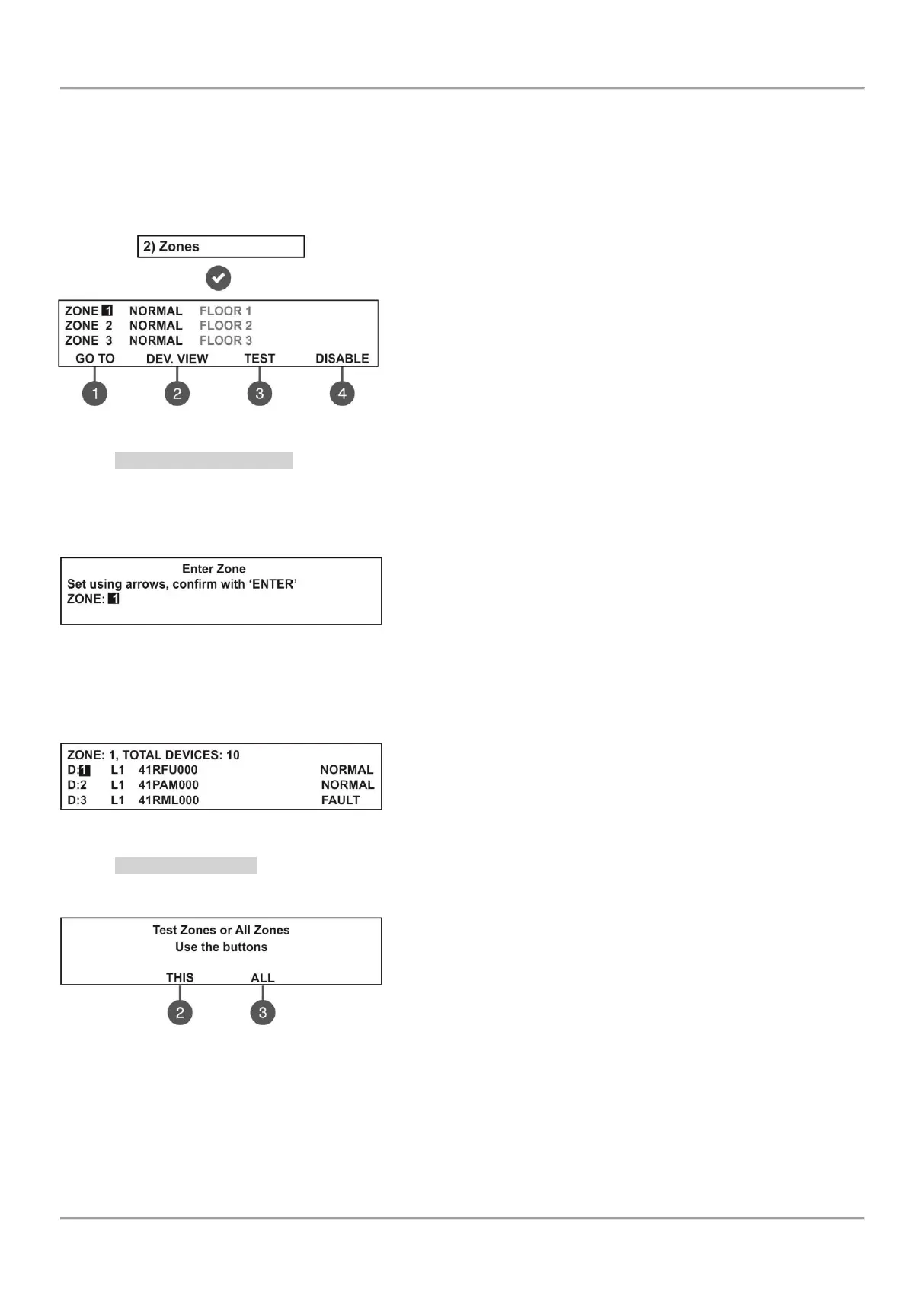 From the main screen of ZONES menu use the functional digit buttons for direct entry to: (1) GO TO and (2) DEV.