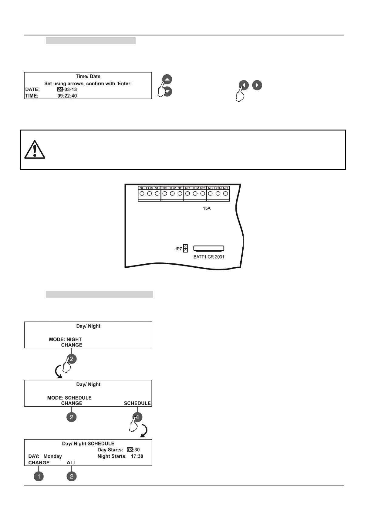 In this submenu the installer can set the current time and date for the panel.