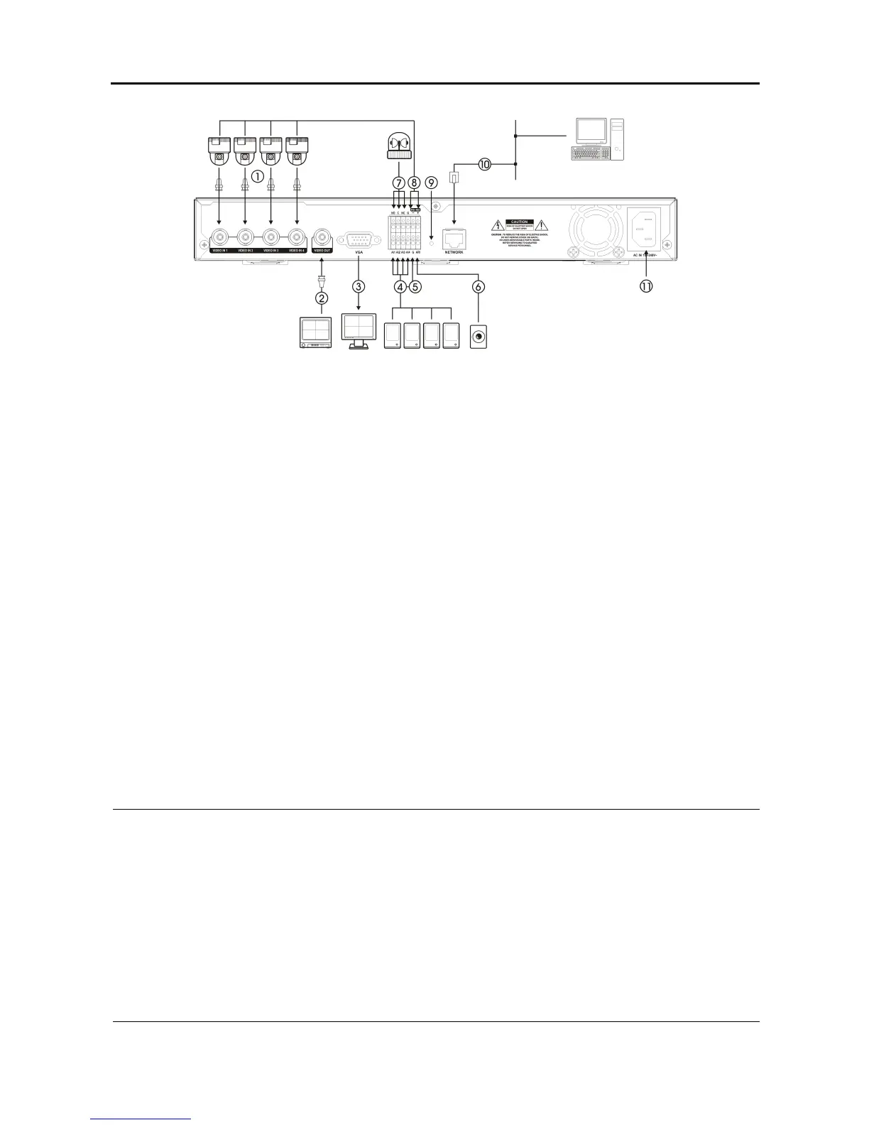 ⑩ Network: Connect a Cat5 cable with an RJ-45 jack. The DVR can be networked with a computer for