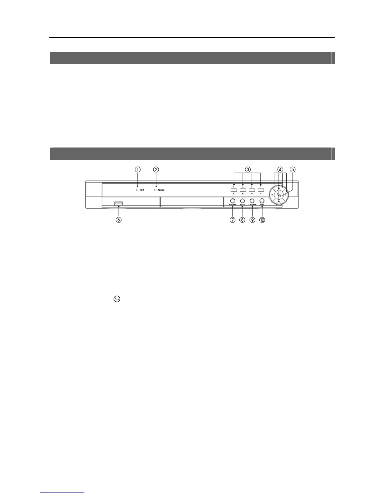 ① HDD LED: The LED flickers when the DVR is recording or searching video on the hard disk drive.