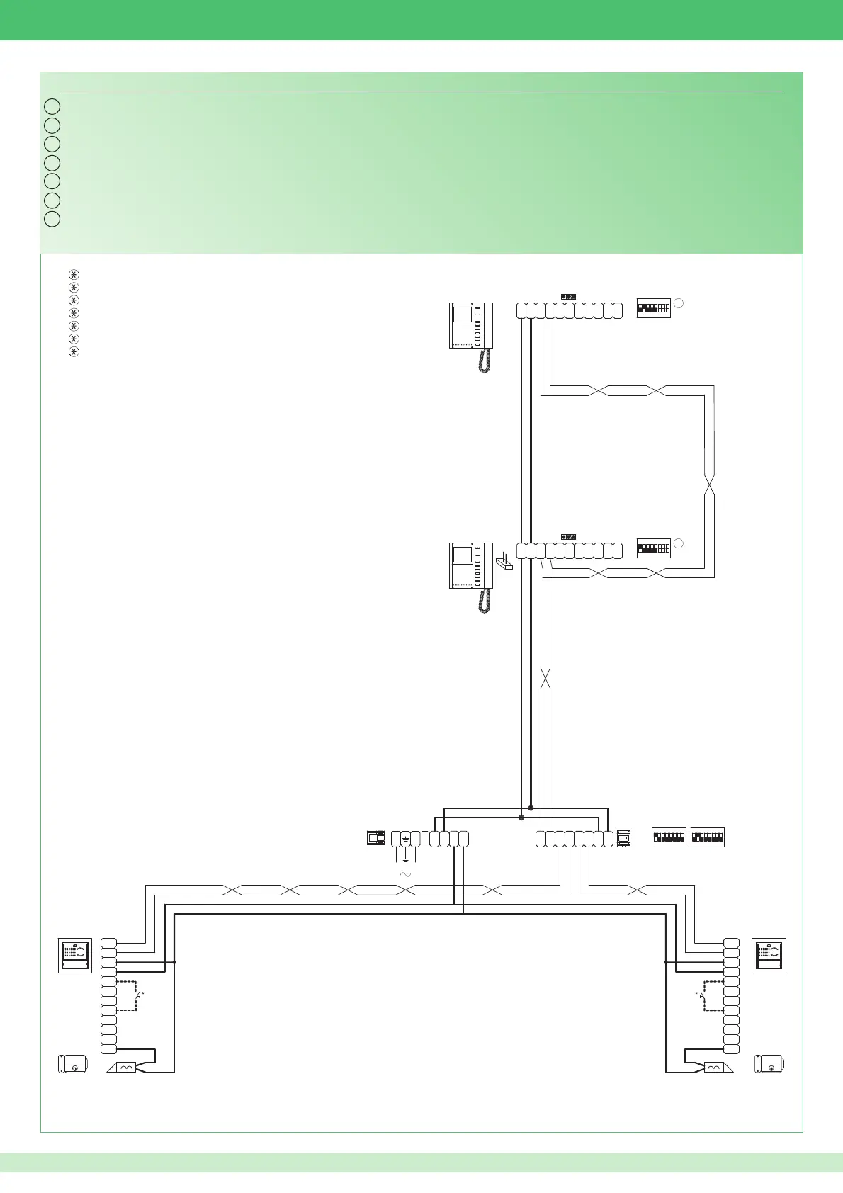 Schema per kit bifamiliari Art. 8173I ampliati con un secondo Art. 4879K. Collegamento in cascata.