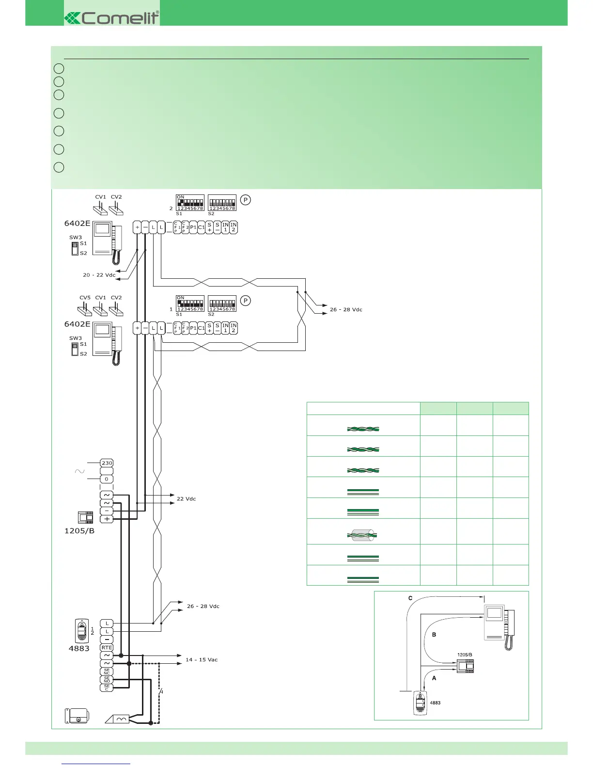 Esquema básico para kits bifamiliares Art. 8472MC com ligação em cascata. Colocação em funcionamento/controlo das tensões do