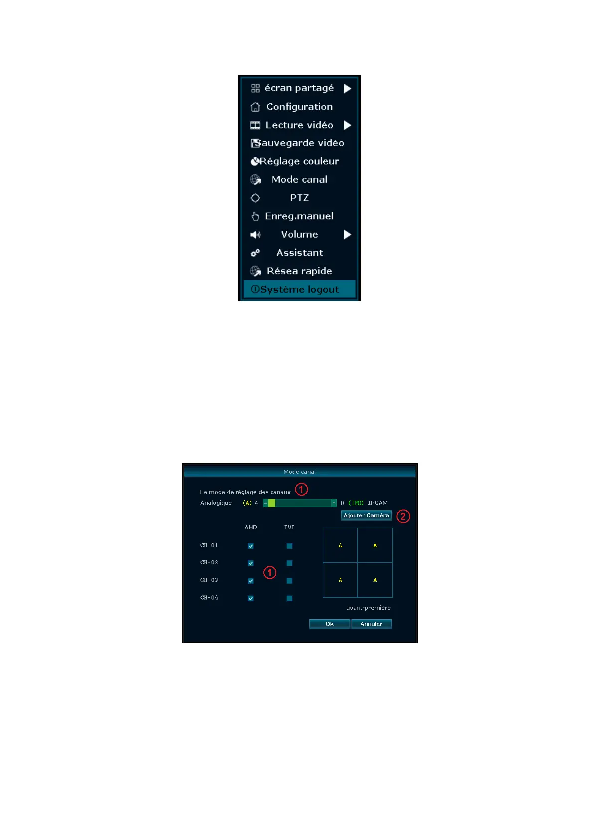 défilement et les box [1], sélectionner le mode des canaux qui seront connectés au DVR (caméras AHD,