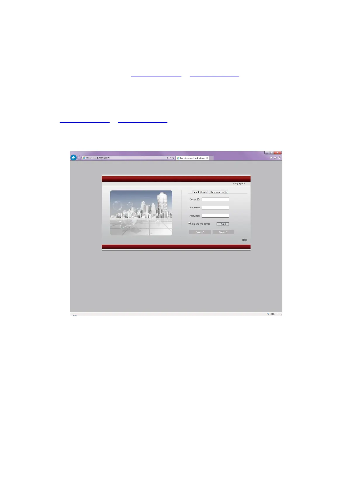 4. Go to www.dvrskype.com or www.e-seenet.com,input Esee ID, user name and password, this user name