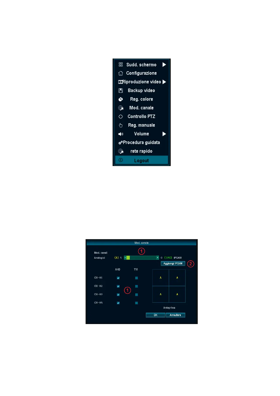 scorrimento e i box di selezione [1], selezionare la modalità dei canali che verranno connessi al DVR