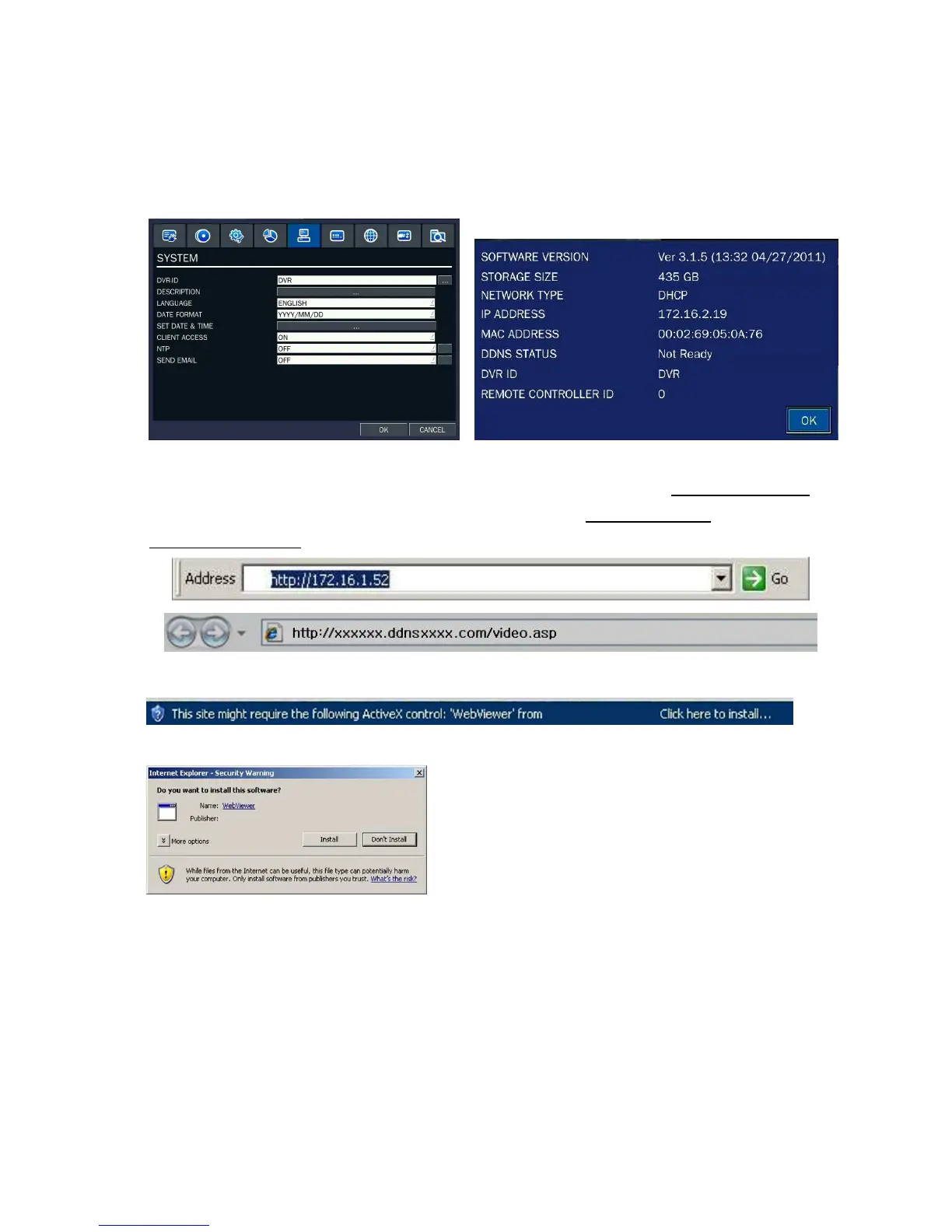 1. Check the IP address of the DVR from SETUP>SYSTEM>DESCRIPTION>IP ADDRESS.