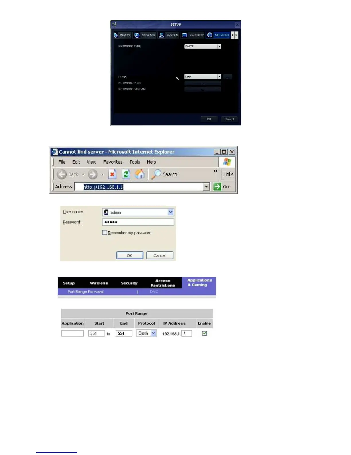 v. IP address: Enter the IP address of the DVR on SETUP>NETWORK>LAN>IP ADDRESS.