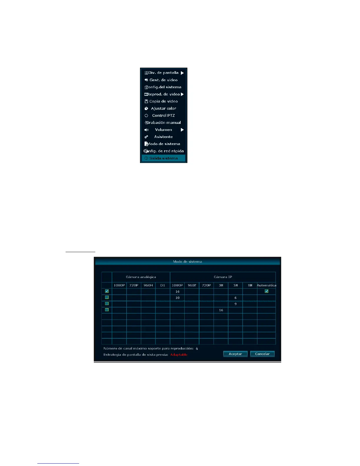 Menú contextual: en la columna de menú, hay: Gest. de vídeo, Config. del sistema, Reprod. de