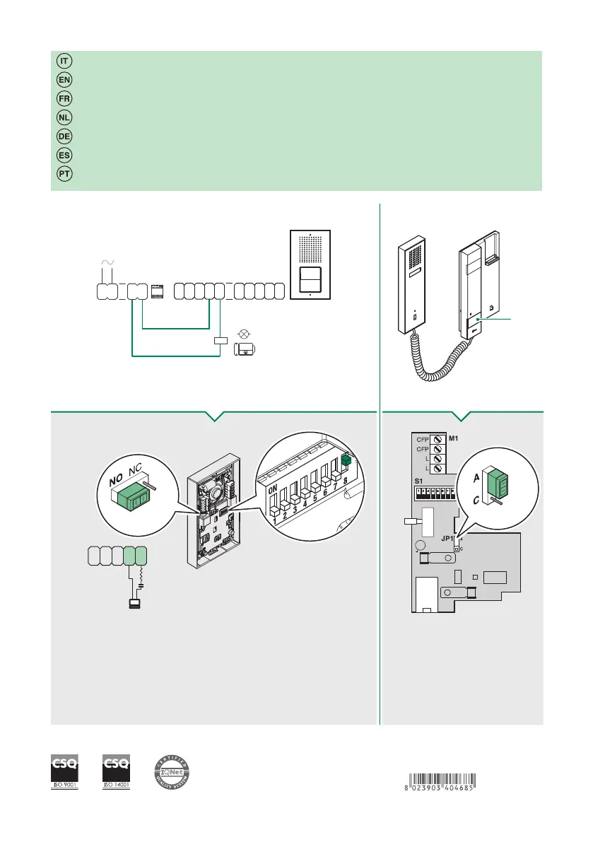 Inschakeling relais C.NC.NO van het deurstation via drukknop P1 van de deurtelefoon