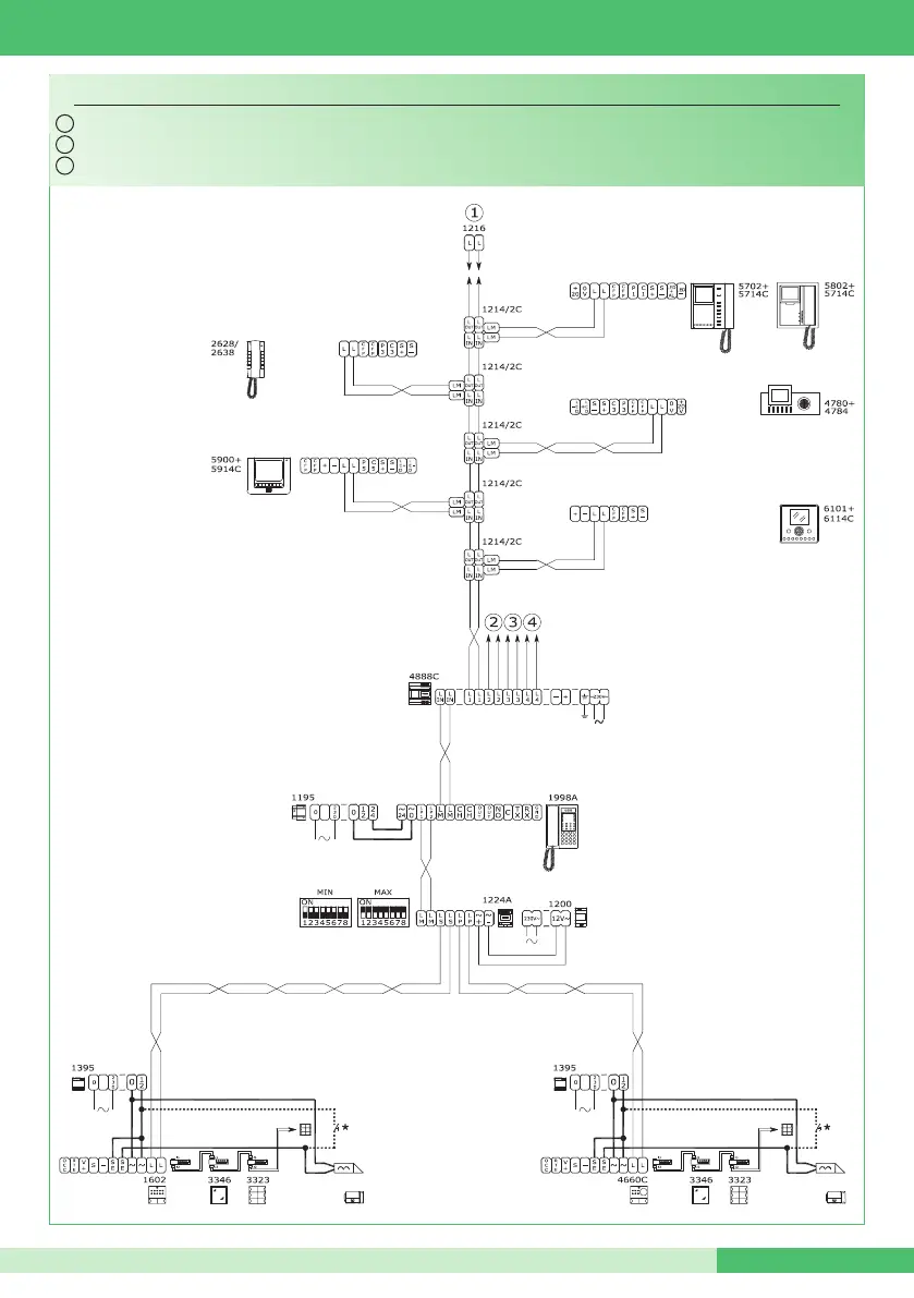 Impianto videocitofonico Simplebus Color con 2 ingressi principali e centralino di portineria.