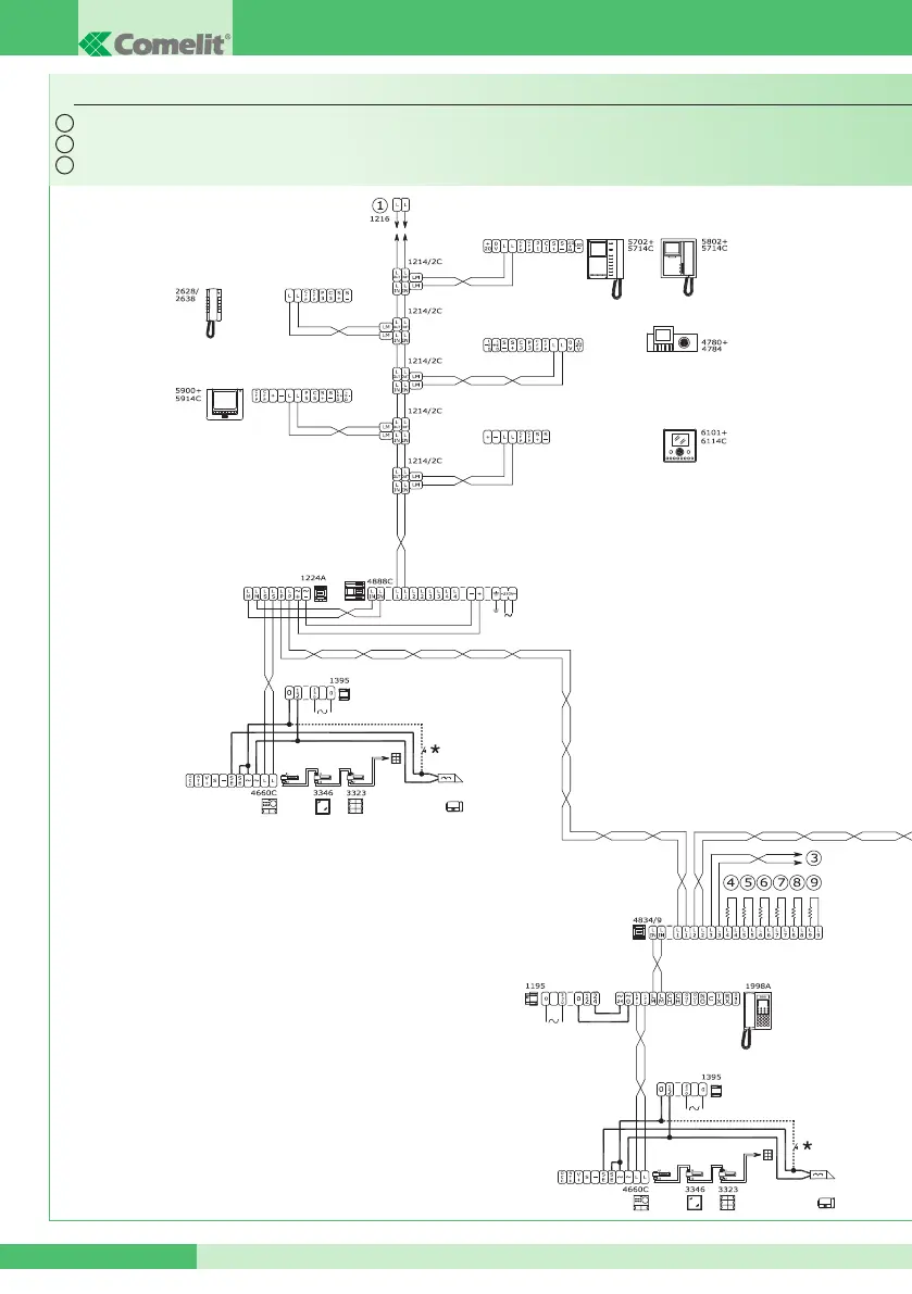 Impianto videocitofonico Simplebus Color con 1 ingresso principale, 3 secondari video e centralino di portineria.