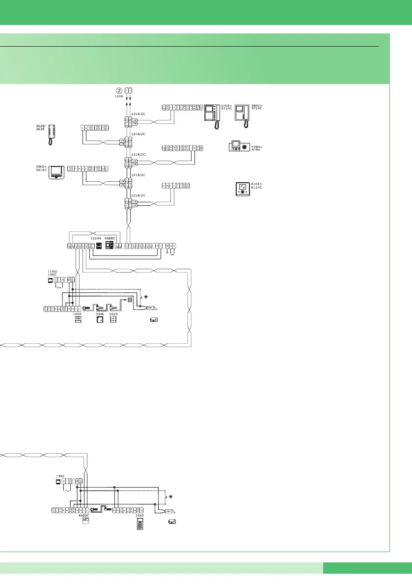 Impianto videocitofonico Simplebus Color con 2 ingressi principali, 3 secondari audio e centralino di portineria.