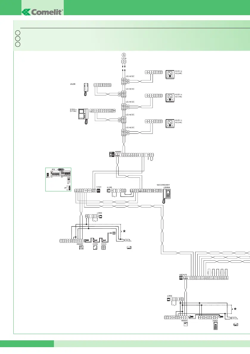 Impianto videocitofonico Simplebus TOP con 1 ingresso principale, 4 secondari e relativi centralini di portineria secondari.