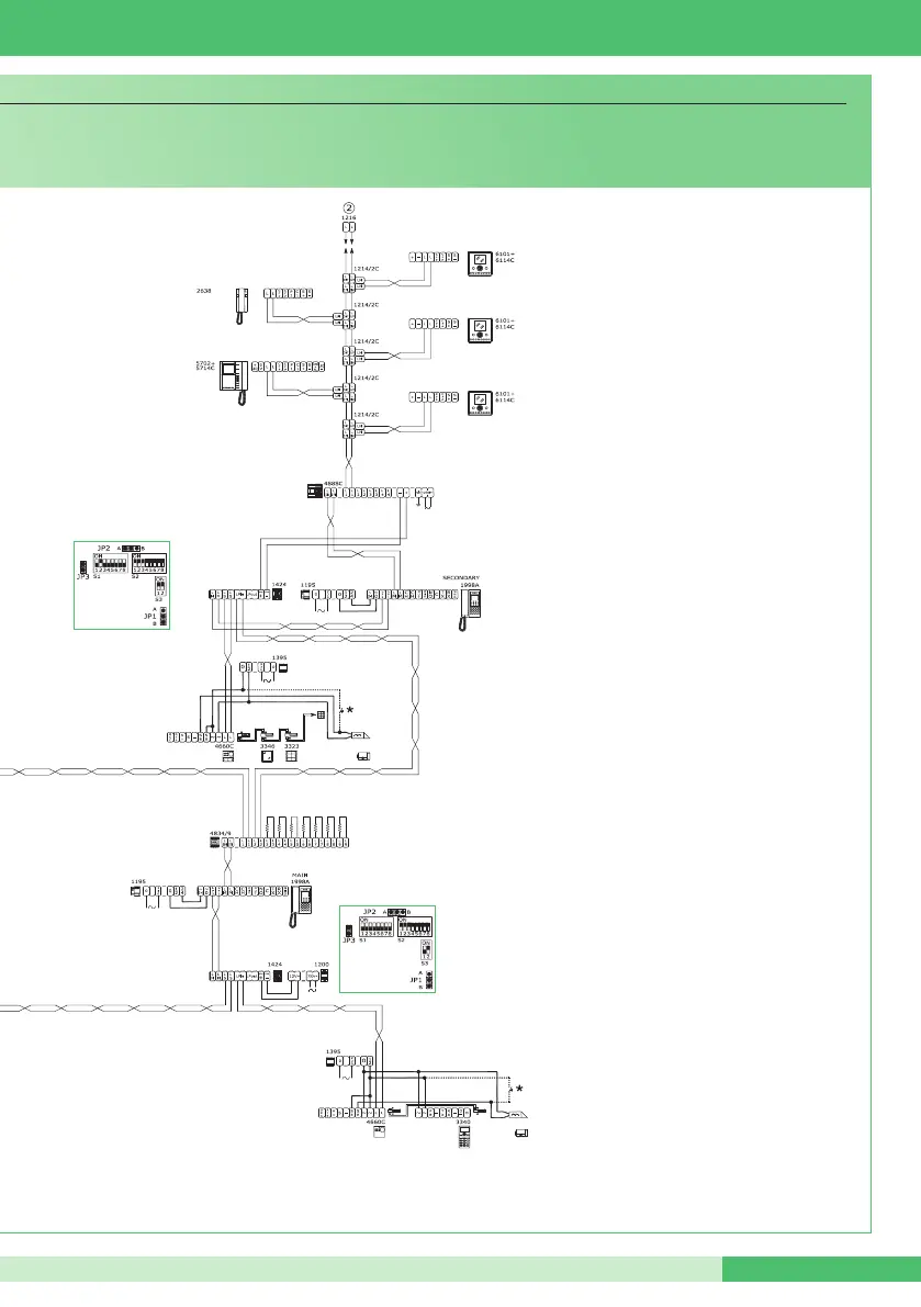 Impianto videocitofonico Simplebus TOP con 2 ingressi principali, 1 centralino di portineria principale, 2 secondari e relativi centralini di portineria secondari.
