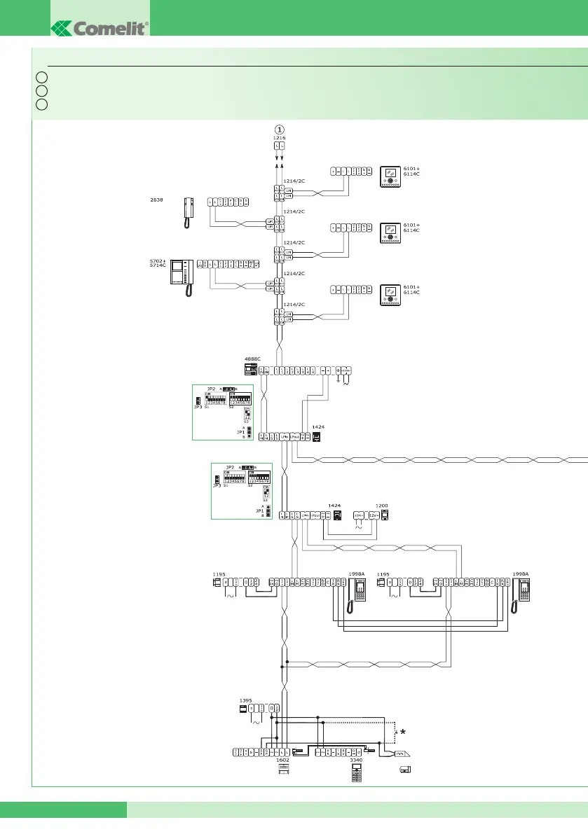Impianto videocitofonico Simplebus TOP con 1 ingresso principale, 3 secondari e 2 centralini di portineria principali in congurazione PARALLELO.