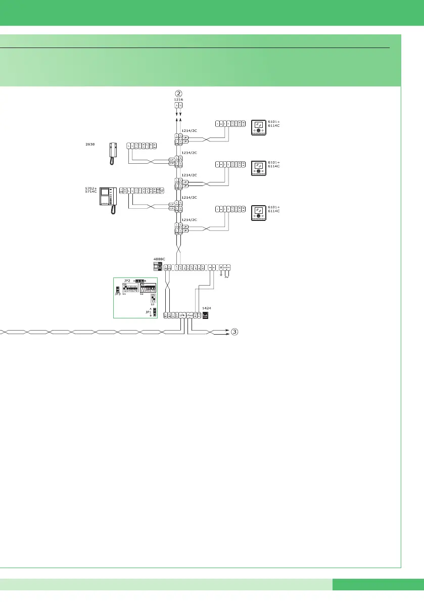 Impianto videocitofonico Simplebus TOP con 1 ingresso principale, 3 secondari e 2 centralini di portineria principali in configurazione PARALLELO.