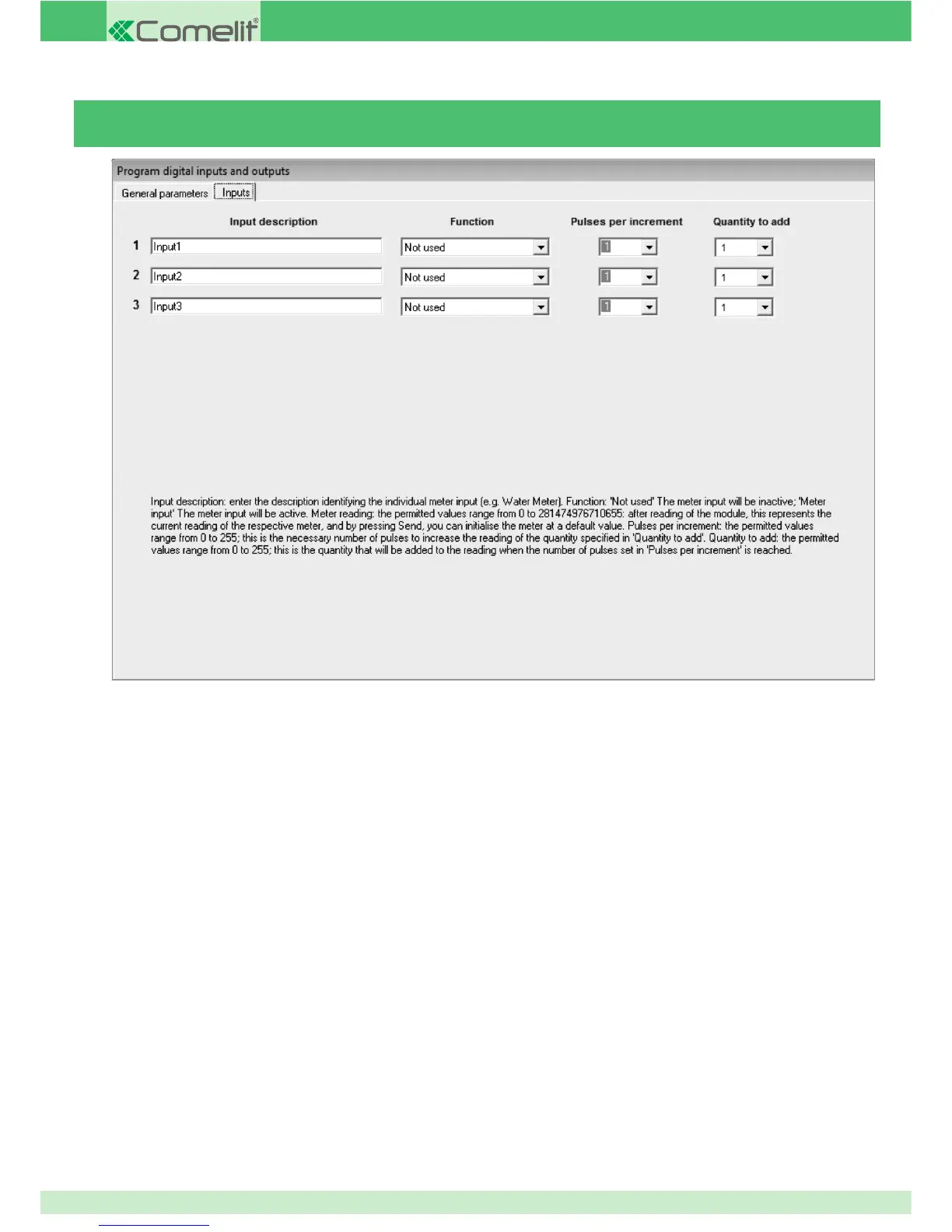 For example, if you connect the input to a pulse water meter which generates a pulse every 2 litres, you will need to enter 1 in the pulses