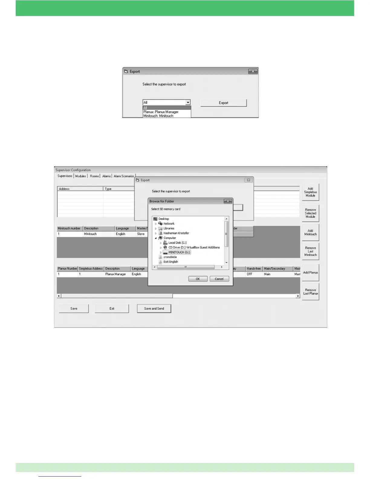 The following example illustrates how to export the confi guration directly onto the Planux Manager monitor SD card. The confi guration