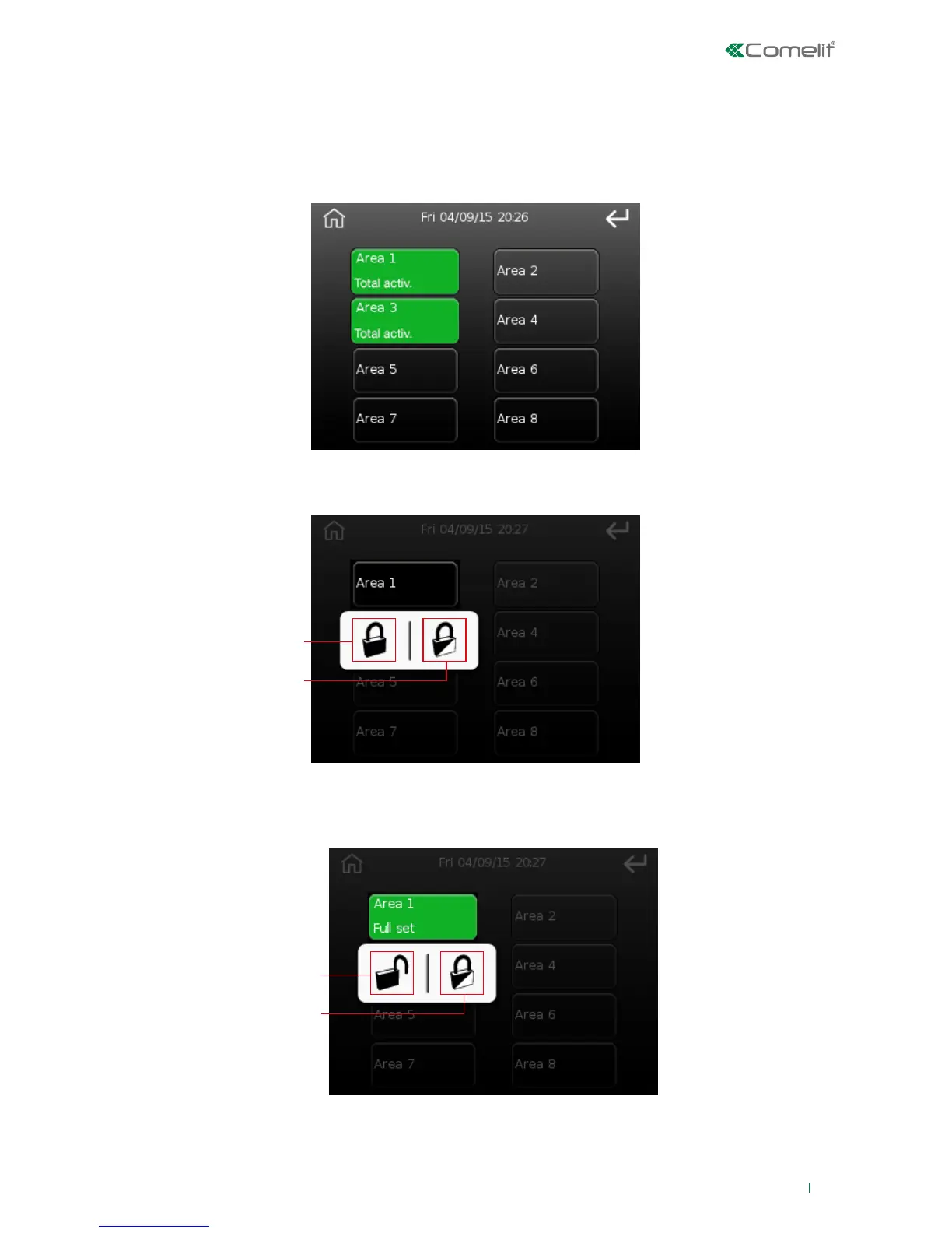 The screen shows the 8 available areas with their buttons, which will be green if the area is activated. Text