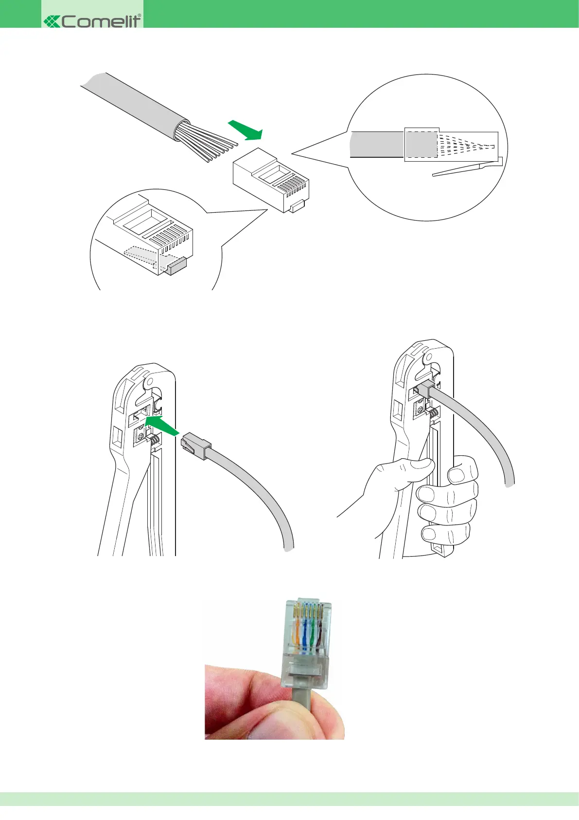 6. Insert the wires into the RJ45 connector, still holding them tightly between your ngers. The connector tab should be facing downwards and not