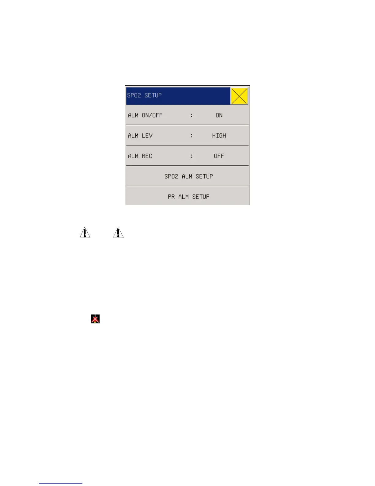 If the monitor SPO2 is NELLCOR ,the “SPO2 ALM SETUP” and “PR ALM STEUP” , according