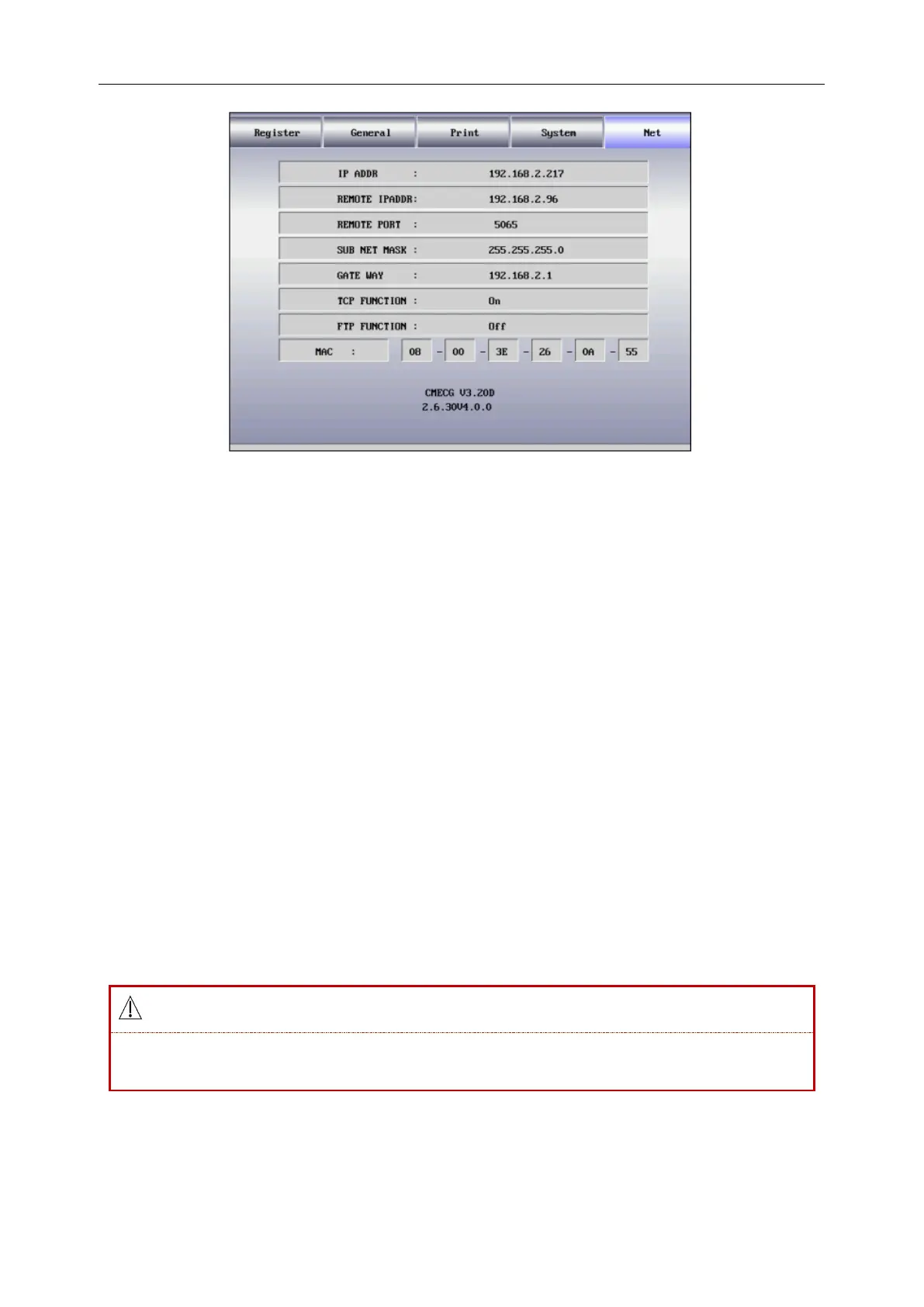 9. CMECG V3.20D(version information of the equipment);2.6.30V4.0.0(copyright information of the