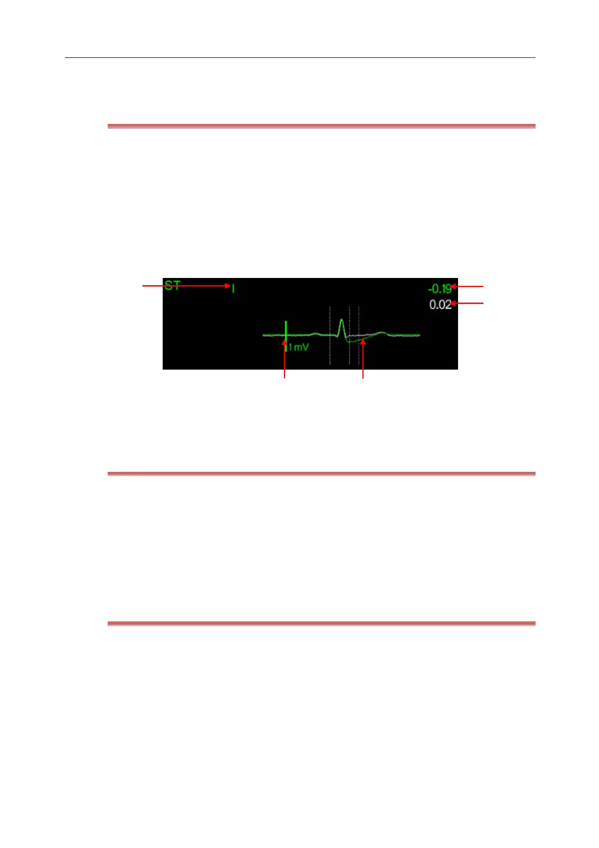 the baseline value. Typically, the current ST segment and parameter values are displayed in green, and the baseline