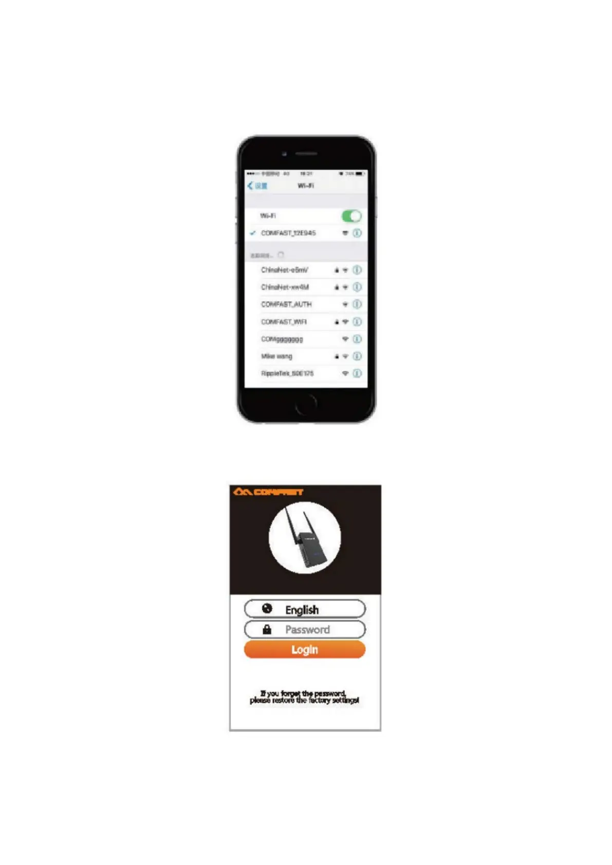 2.2.1 Plug the WiFi repeater into an outlet. Conenct the WiFi name of “COMFAST_XXXX”