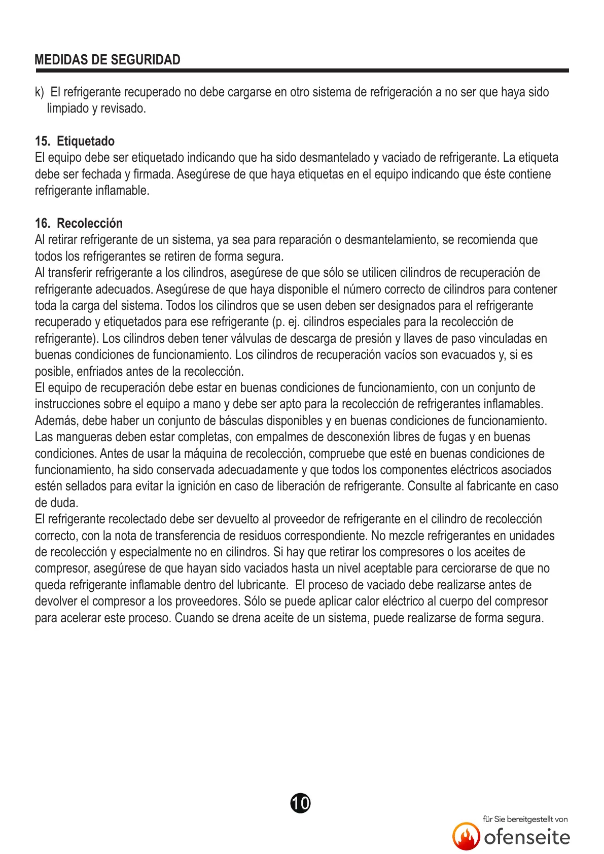 k) El refrigerante recuperado no debe cargarse en otro sistema de refrigeración a no ser que haya sido