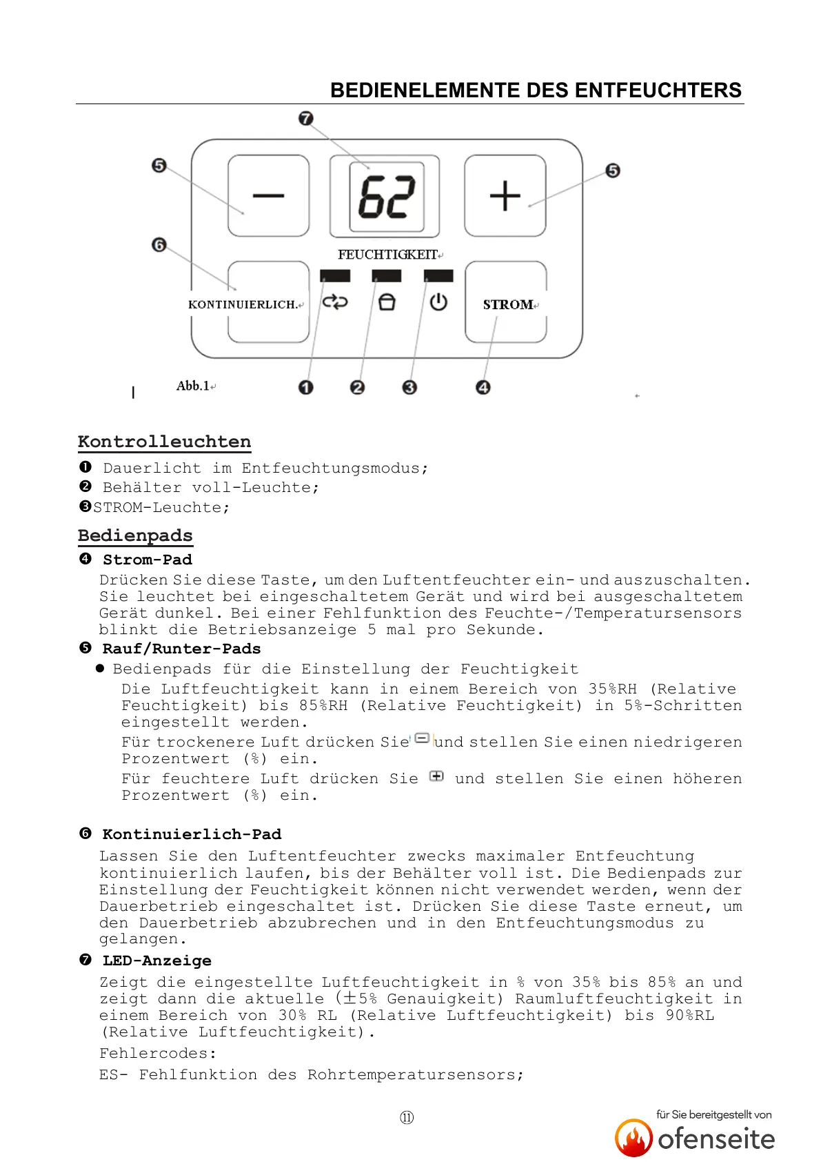 BEDIENELEMENTE DES ENTFEUCHTERS