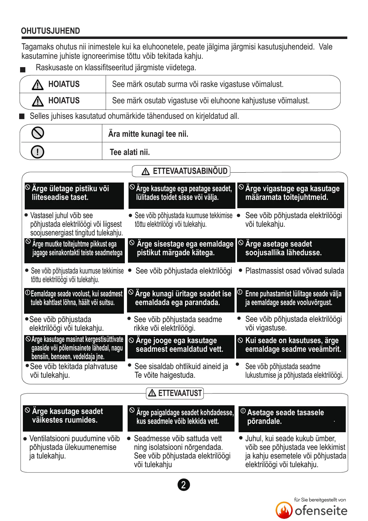 Tagamaks ohutus nii inimestele kui ka eluhoonetele, peate jälgima järgmisi kasutusjuhendeid. Vale