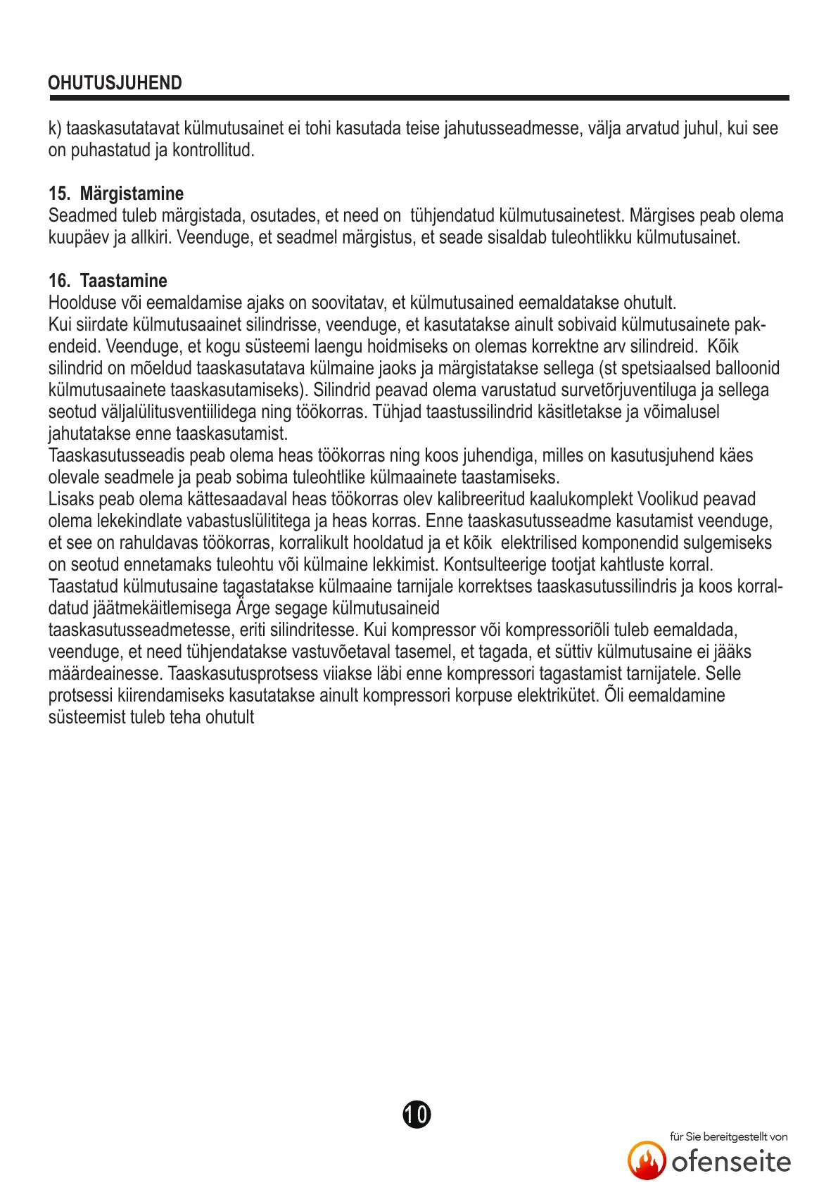 k) taaskasutatavat külmutusainet ei tohi kasutada teise jahutusseadmesse, välja arvatud juhul, kui see