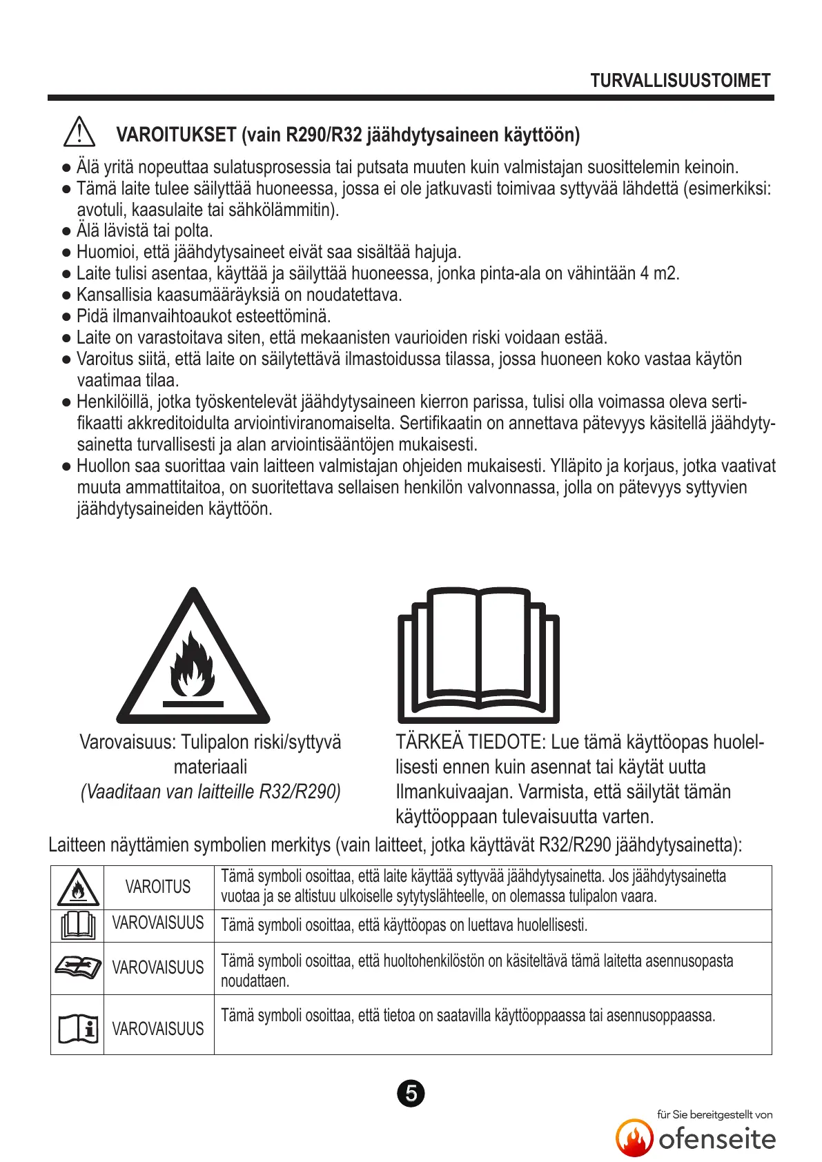 VAROITUKSET (vain R290/R32 jäähdytysaineen käyttöön)