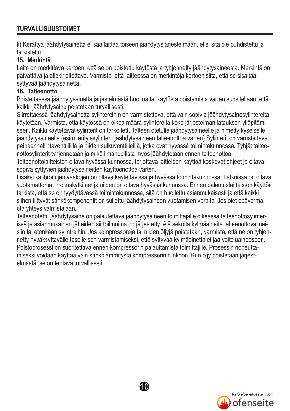 k) Kerättyä jäähdytysainetta ei saa laittaa toiseen jäähdytysjärjestelmään, ellei sitä ole puhdistettu ja