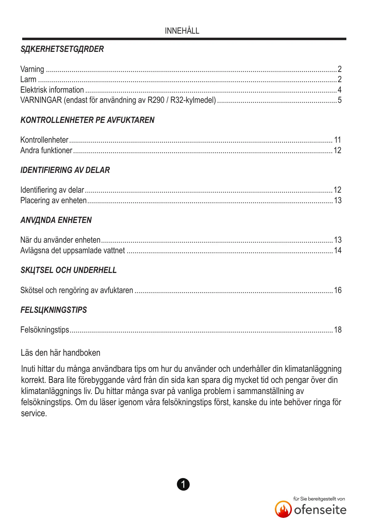Skötsel och rengöring av avfuktaren .....................................................................................................16