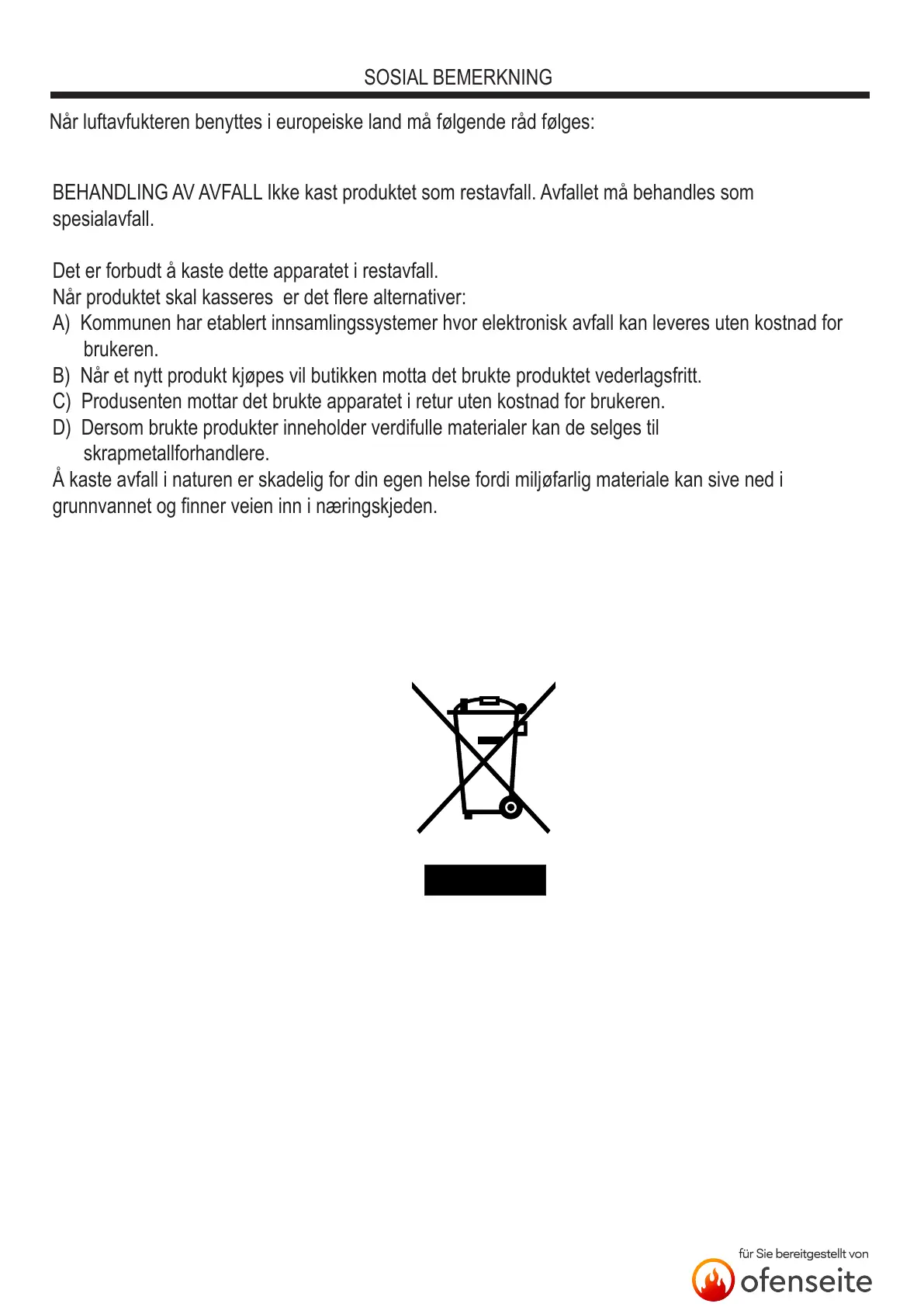 Når luftavfukteren benyttes i europeiske land må følgende råd følges: