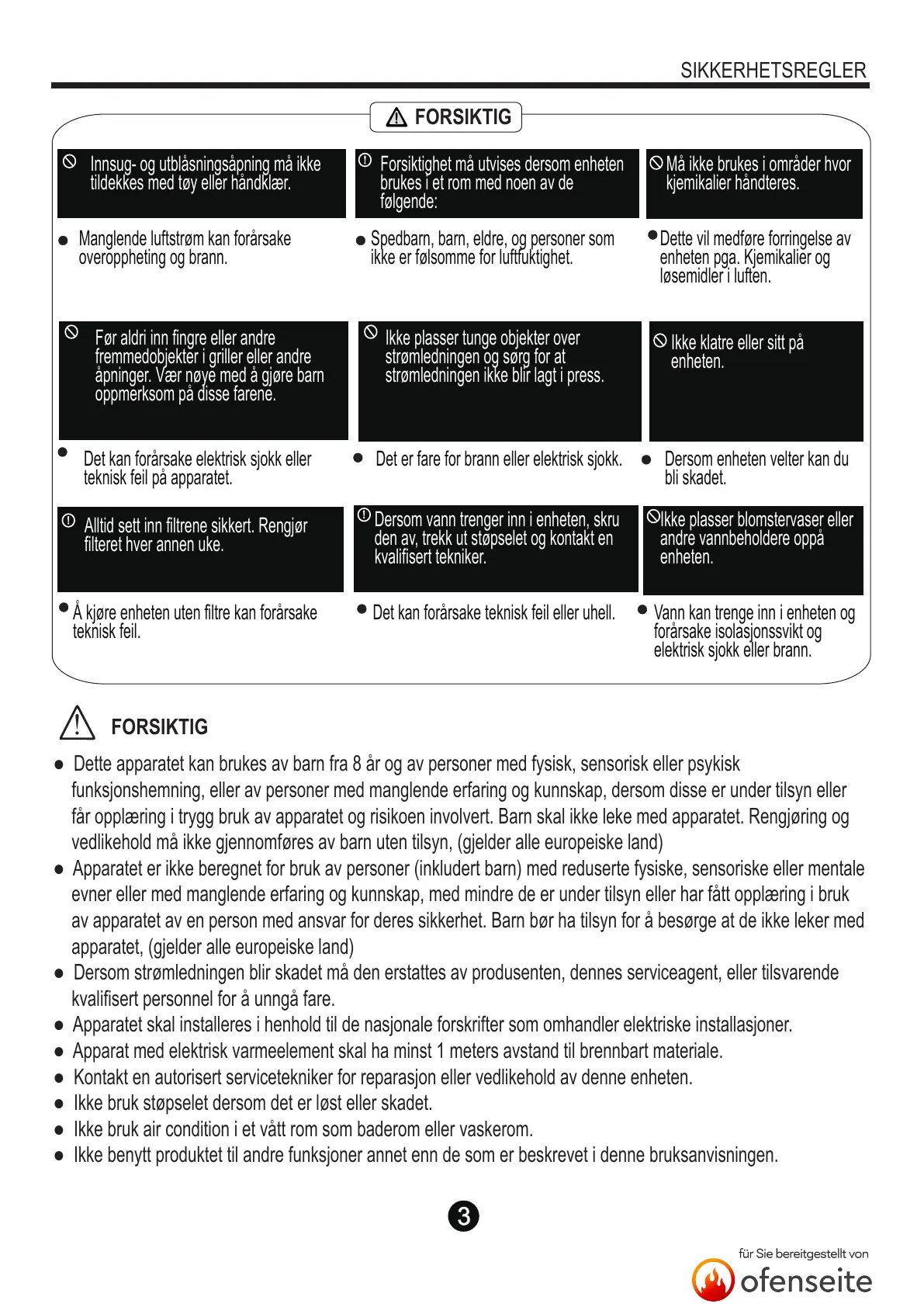 ● Apparat med elektrisk varmeelement skal ha minst 1 meters avstand til brennbart materiale.