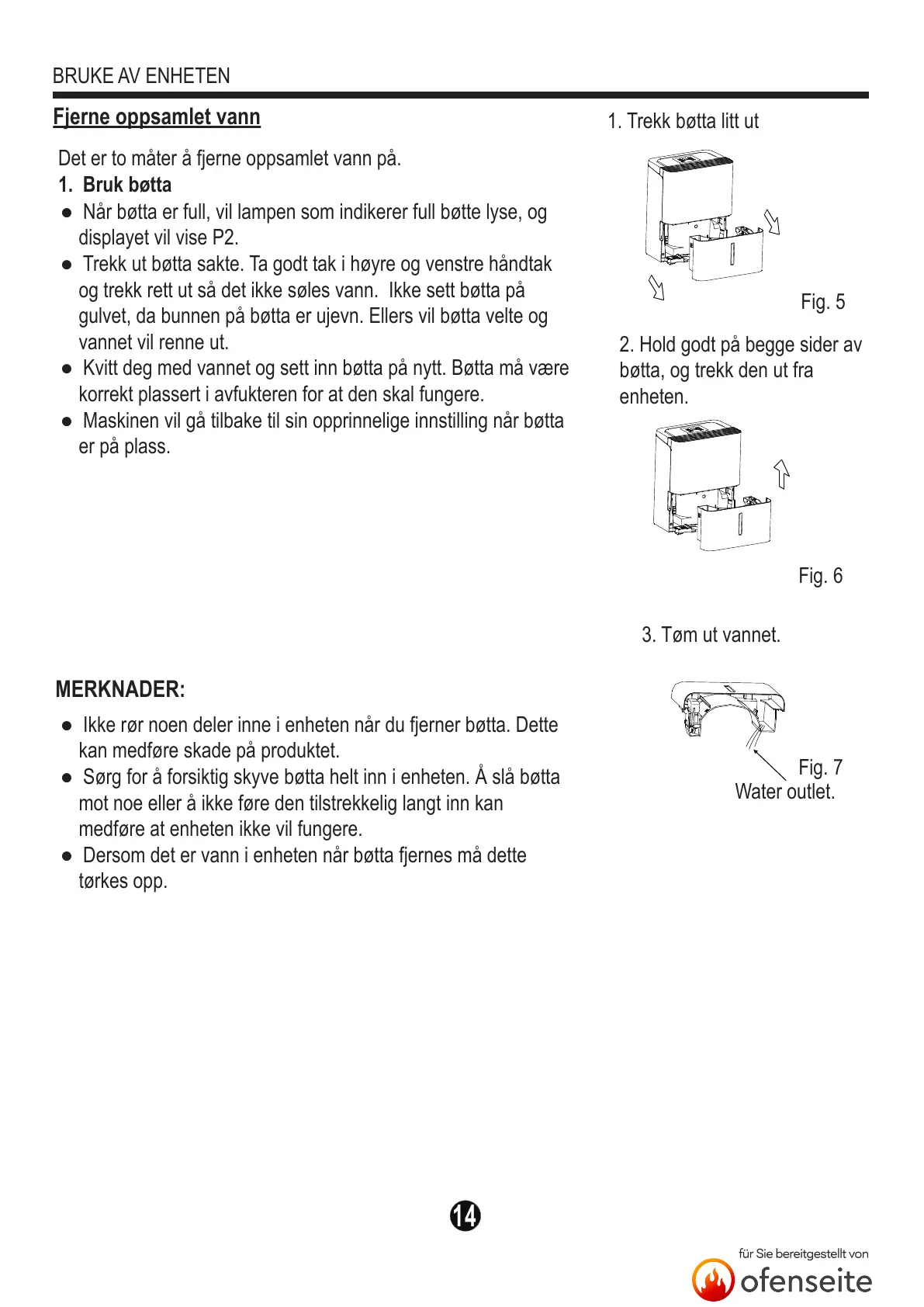 ● Dersom det er vann i enheten når bøtta fjernes må dette