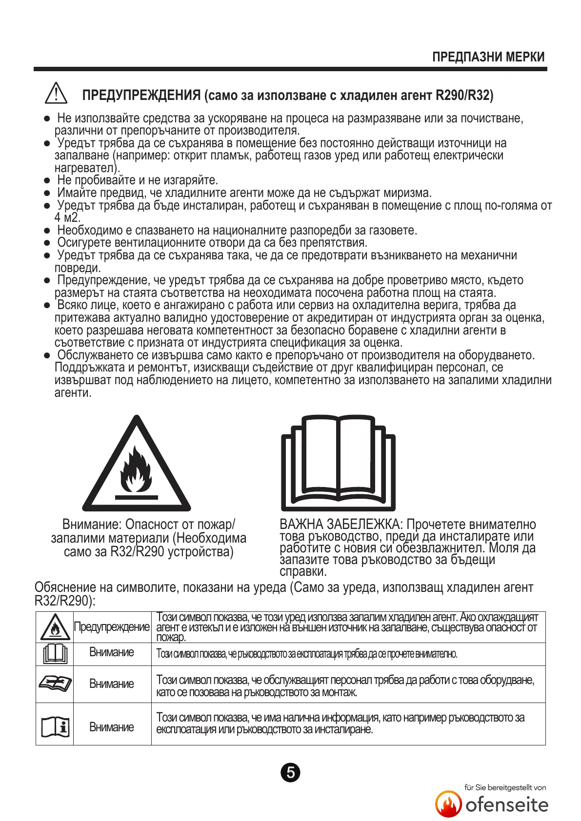 ПРЕДУПРЕЖДЕНИЯ (само за използване с хладилен агент R290/R32)