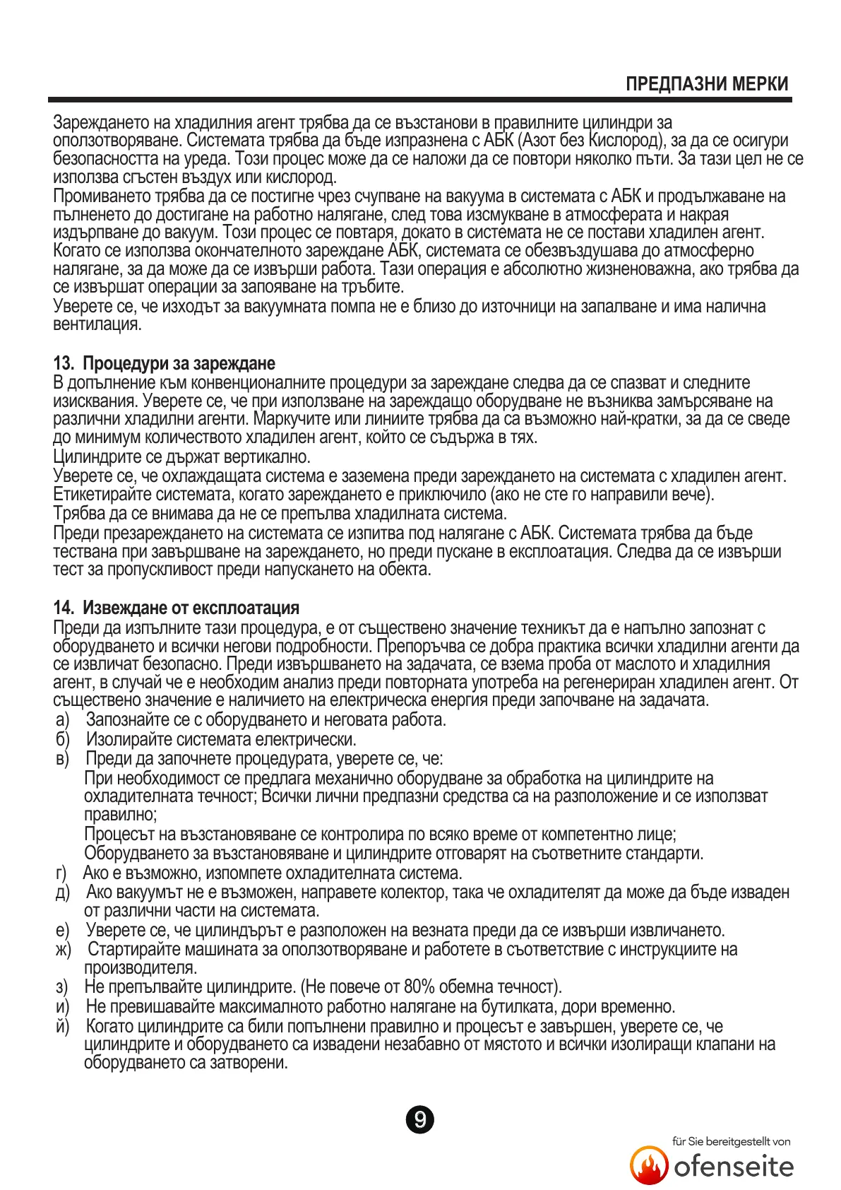 оползотворяване. Системата трябва да бъде изпразнена с АБК (Азот без Кислород), за да се осигури