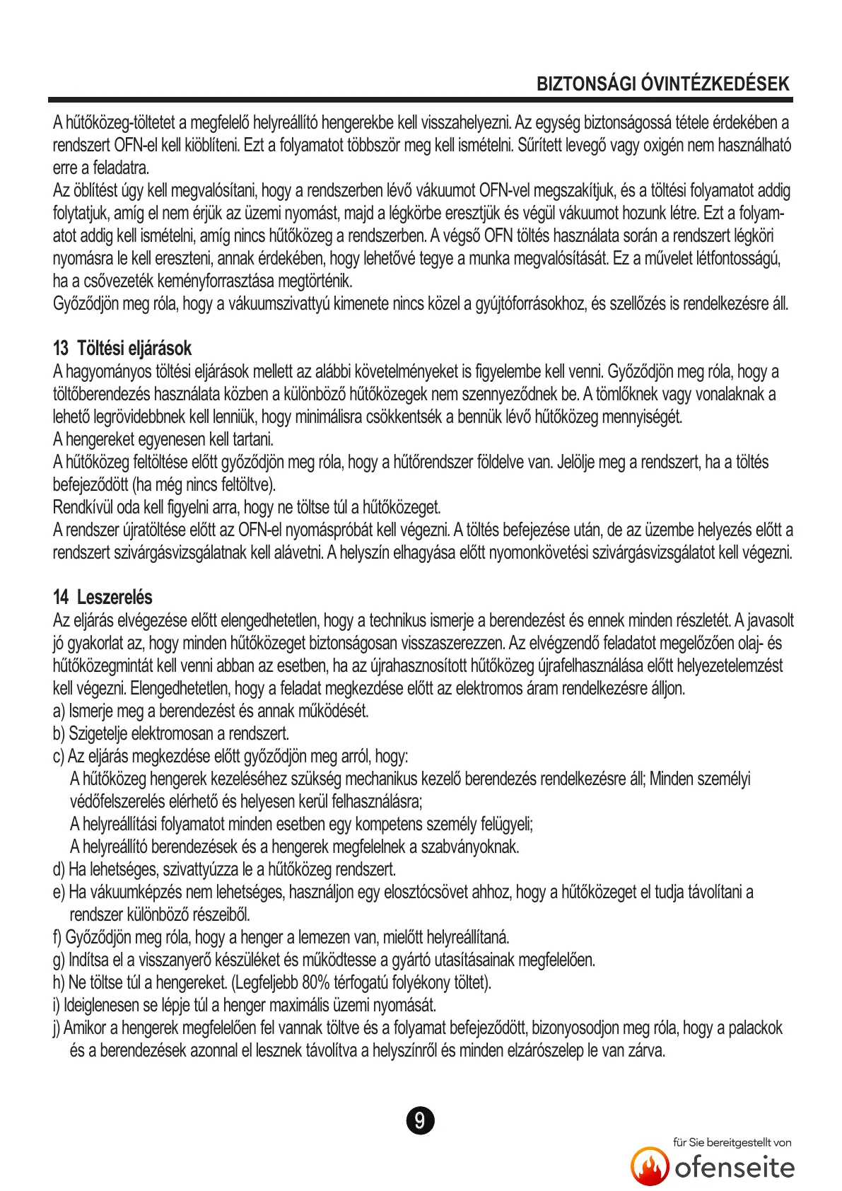 A rendszer újratöltése előtt az OFN-el nyomáspróbát kell végezni. A töltés befejezése után, de az üzembe helyezés előtt a