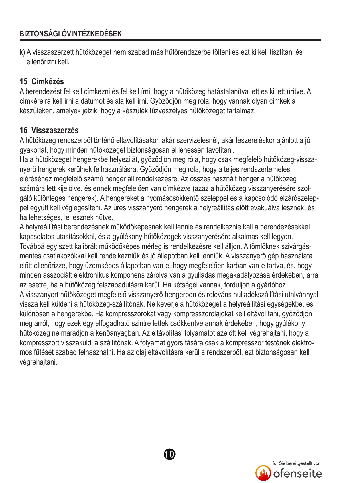 k) A visszaszerzett hűtőközeget nem szabad más hűtőrendszerbe tölteni és ezt ki kell tisztítani és