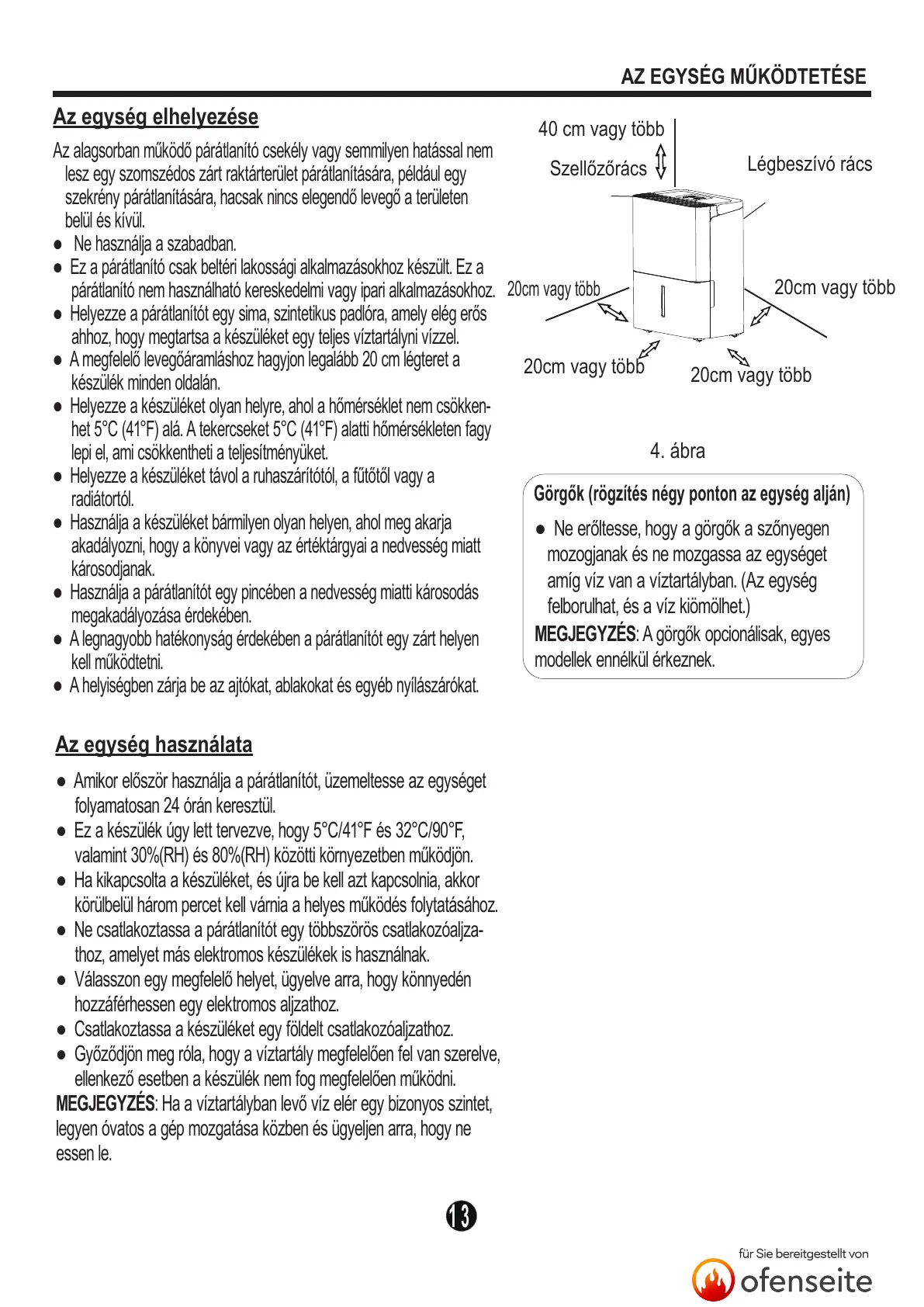● A legnagyobb hatékonyság érdekében a párátlanítót egy zárt helyen
