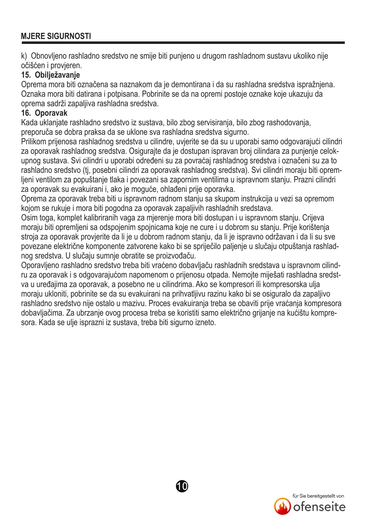 k) Obnovljeno rashladno sredstvo ne smije biti punjeno u drugom rashladnom sustavu ukoliko nije