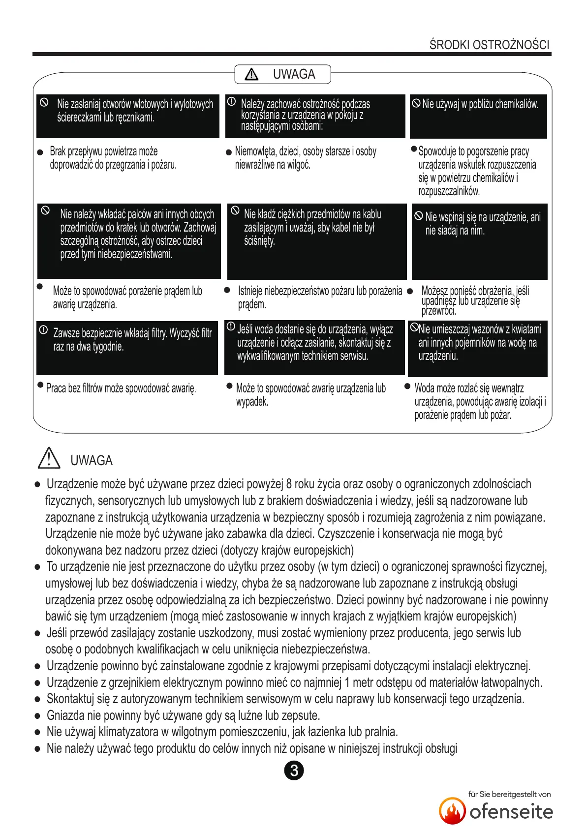 ● Nie używaj klimatyzatora w wilgotnym pomieszczeniu, jak łazienka lub pralnia.