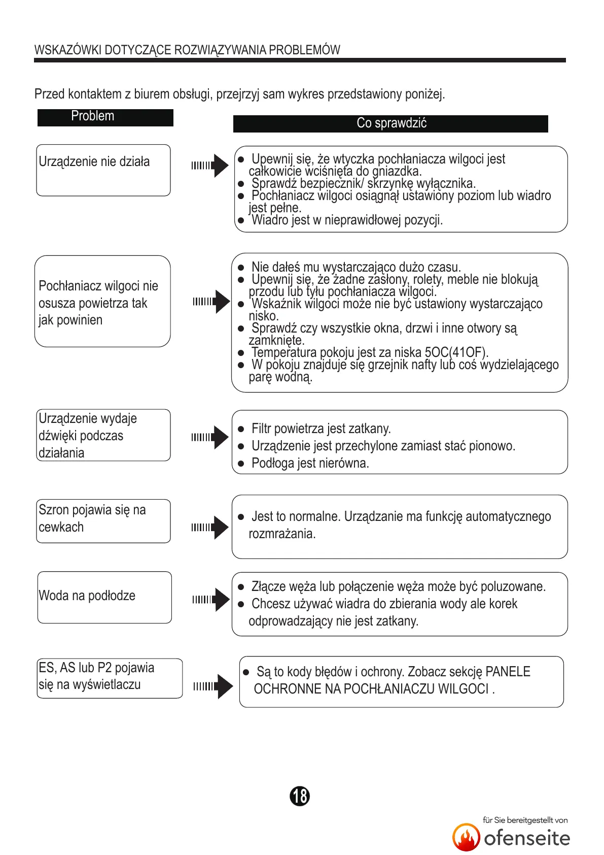 ● Pochłaniacz wilgoci osiągnął ustawiony poziom lub wiadro
