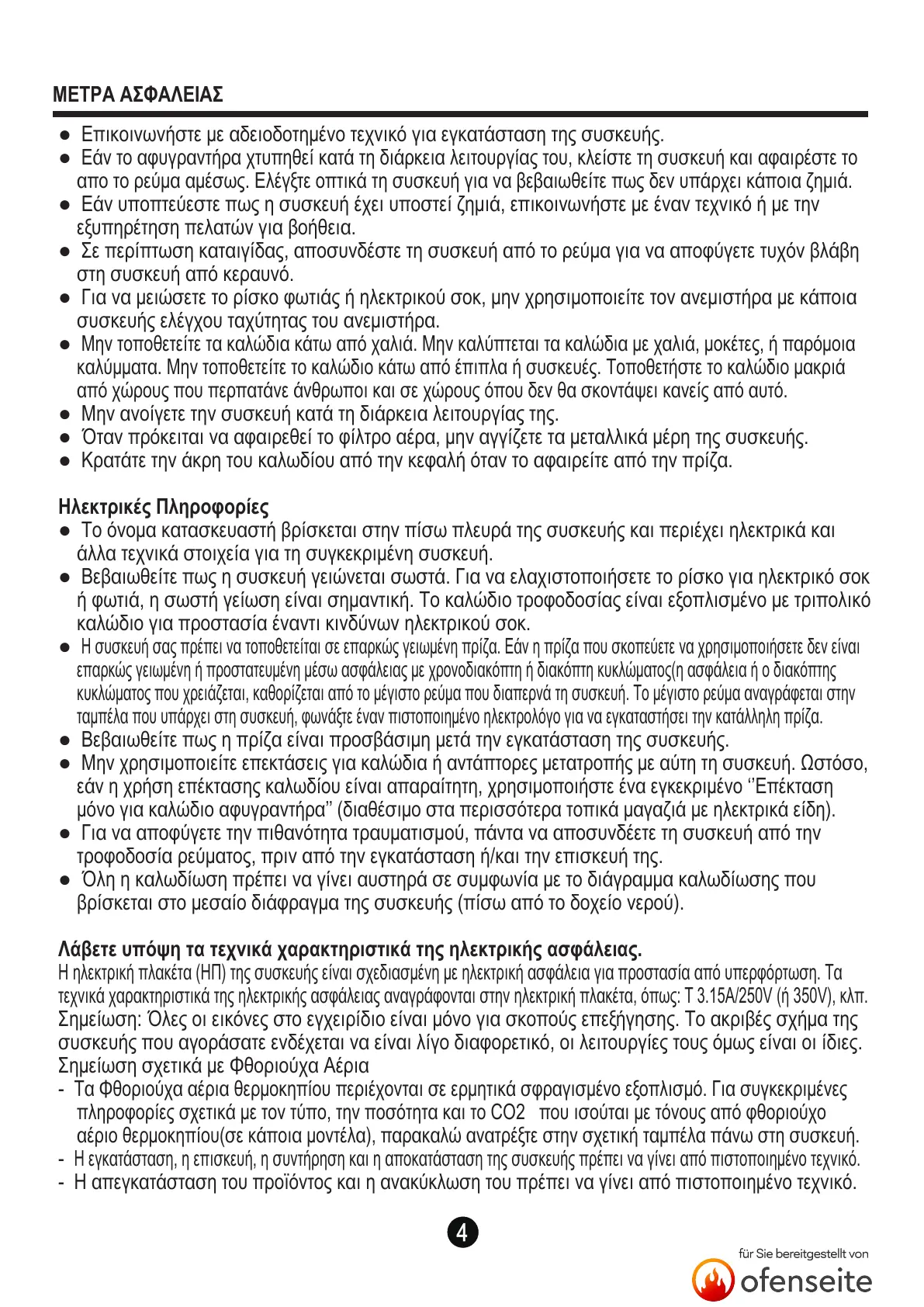 τεχνικά χαρακτηριστικά της ηλεκτρικής ασφάλειας αναγράφονται στην ηλεκτρική πλακέτα, όπως: T 3.15A/250V (ή 350V), κλπ.