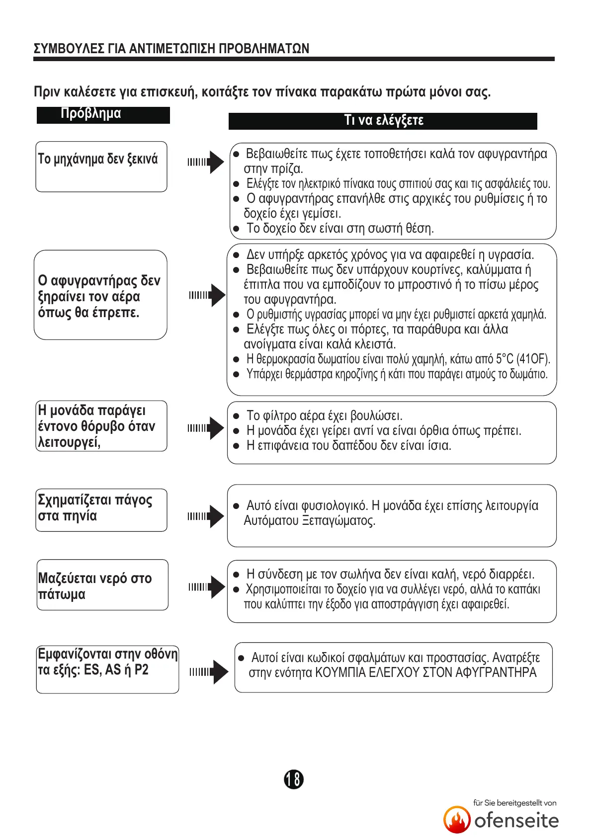 Πριν καλέσετε για επισκευή, κοιτάξτε τον πίνακα παρακάτω πρώτα μόνοι σας.