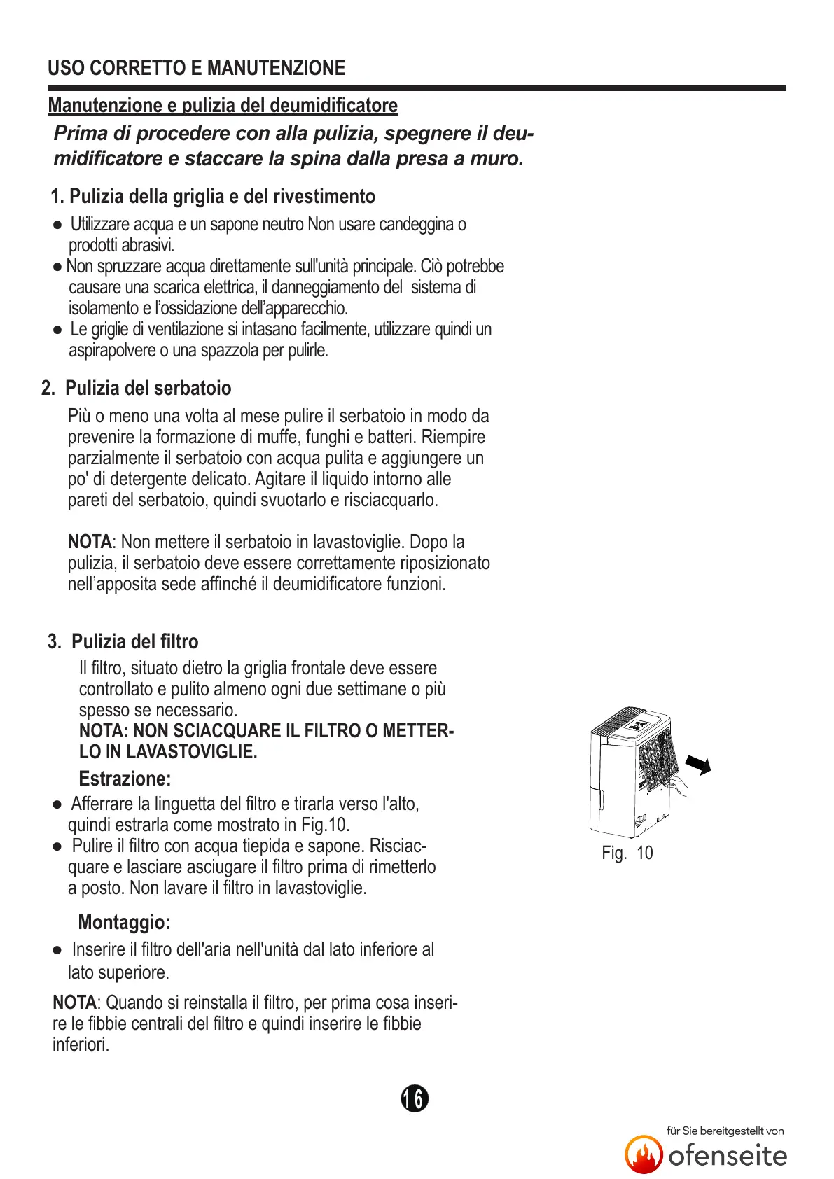● Pulire il filtro con acqua tiepida e sapone. Risciac-