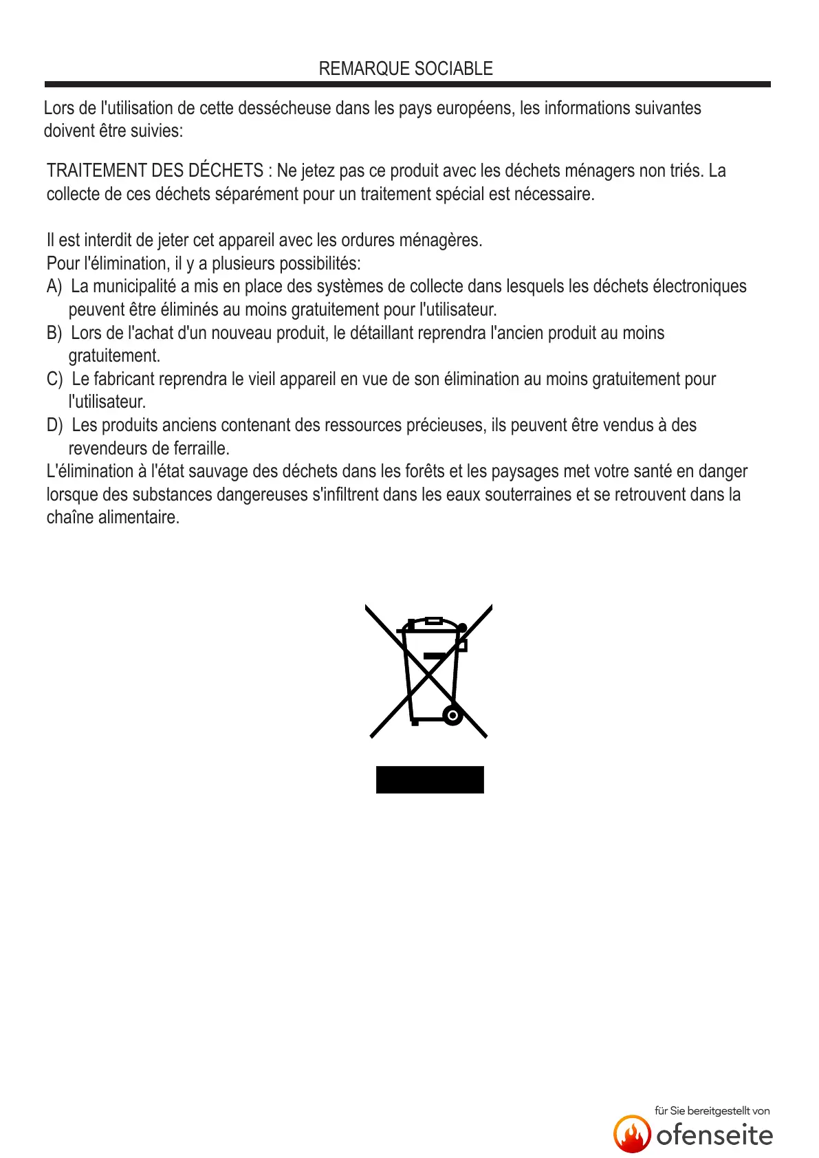 Lors de l'utilisation de cette dessécheuse dans les pays européens, les informations suivantes